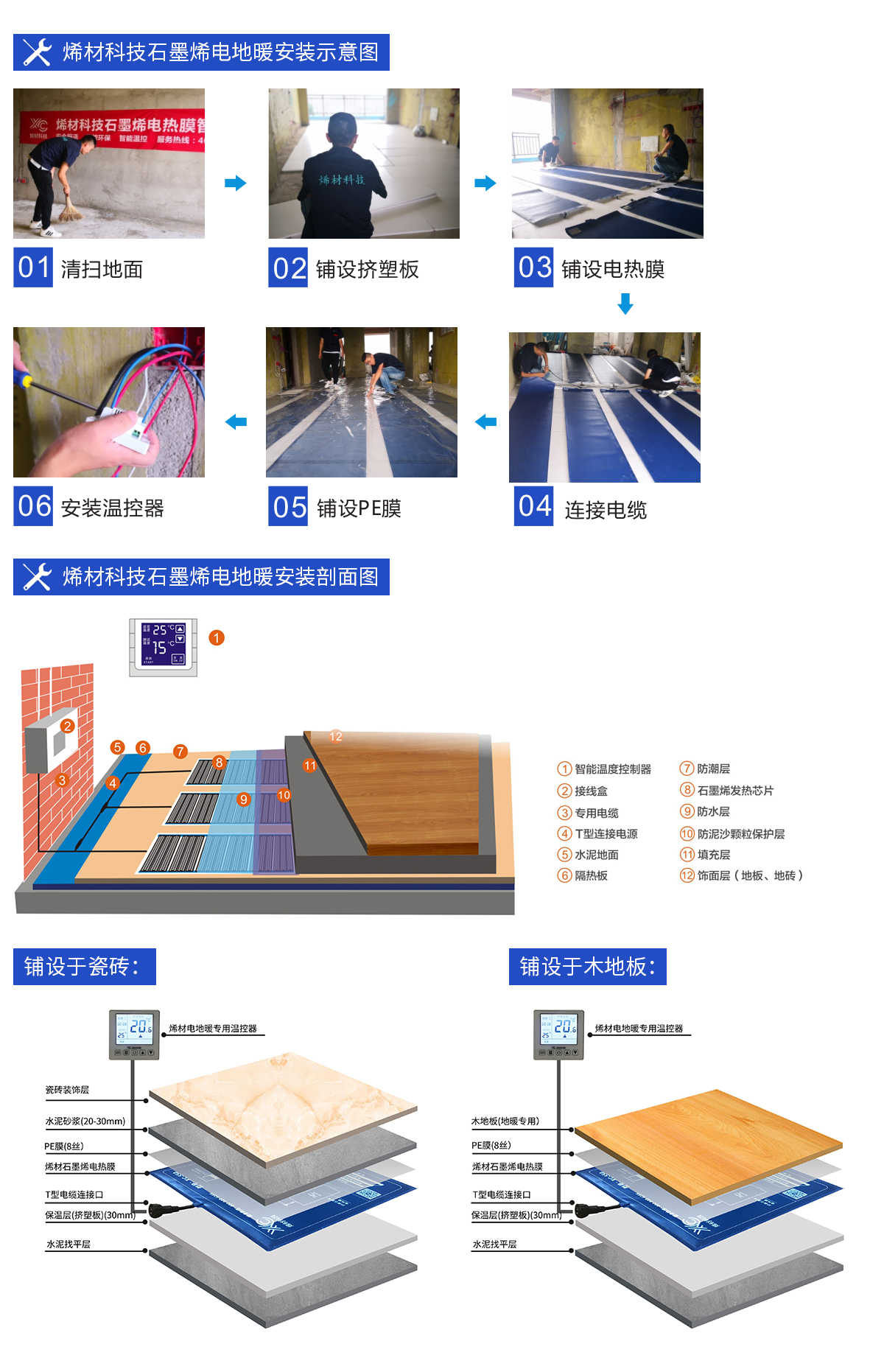 石墨烯遠紅外電熱膜供暖系統(tǒng):石墨烯電熱膜片、T型電纜、絕緣防水快速插頭、溫控器及溫度傳感器、自動控制電抗器等部件組成。
